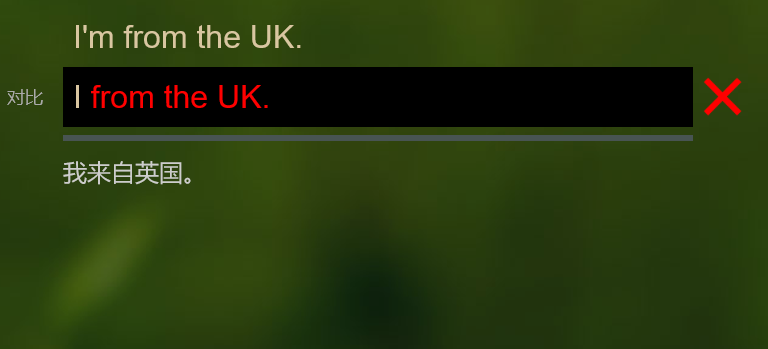 红色叉号代表拼写错误,并且在提交的答案上用红色标记出拼写错误的单词,按回车键进行下一步句子抄写训练